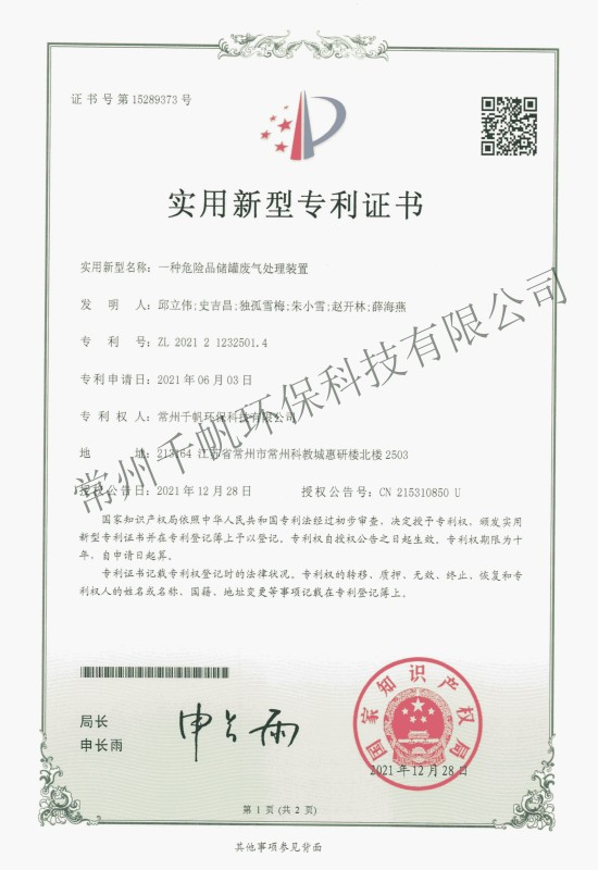 實(shí)用新型專利證書 一種危險(xiǎn)品儲(chǔ)罐廢氣處理裝置