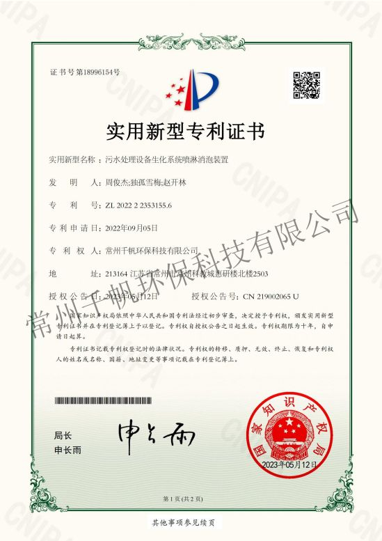 實(shí)用新型專利證書 污水處理設(shè)備生化系統(tǒng)噴淋消泡裝置